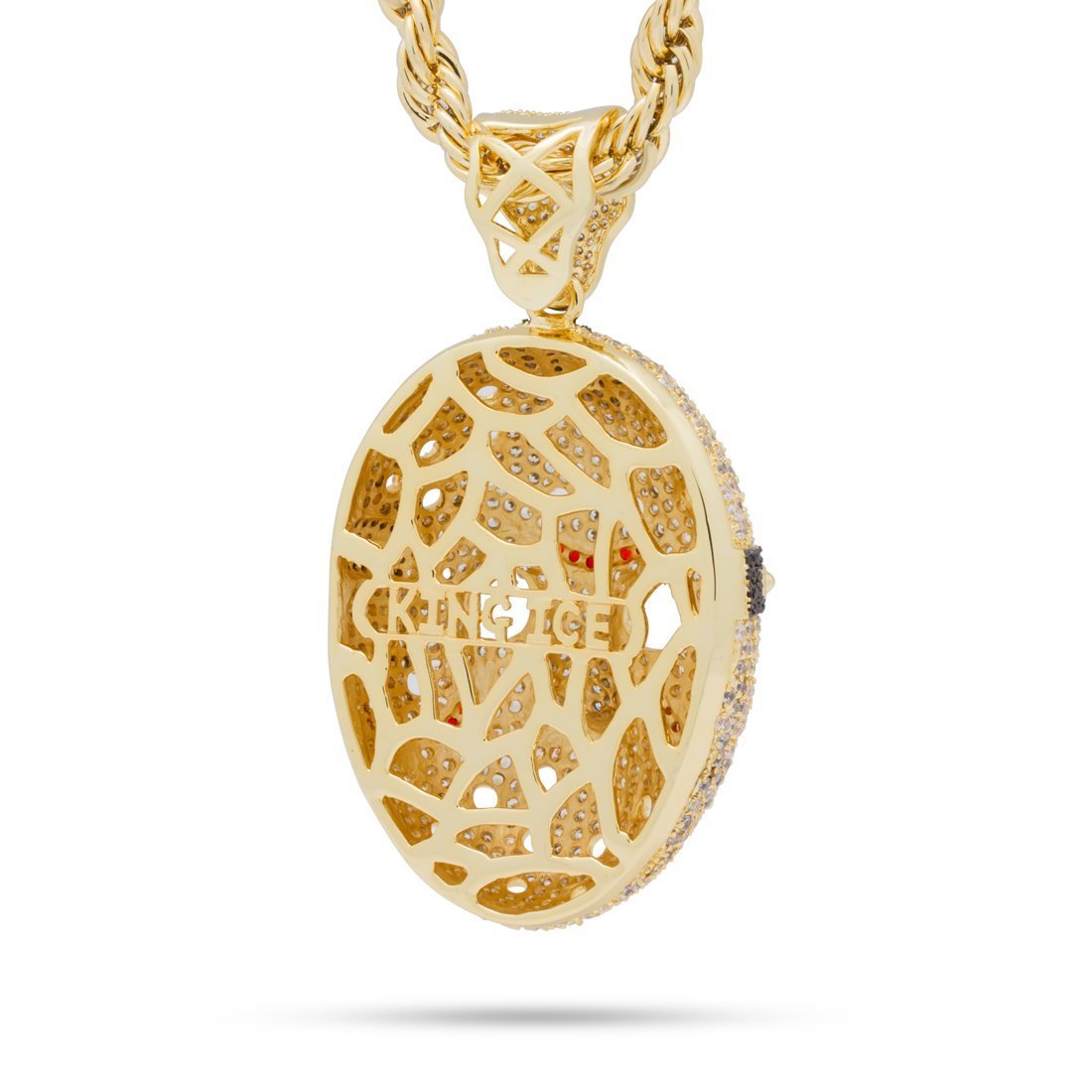 Step up your game by adding this iced Hockey Mask to your jewelry collection. Plated in 14K Gold plating or white gold plating and lined with clear, red and onyx colored CZ stones, the iconic mask creates an eerie look with a caged back that features the King Ice logo. Each pendant includes an 8mm, 26" Rope Chain.