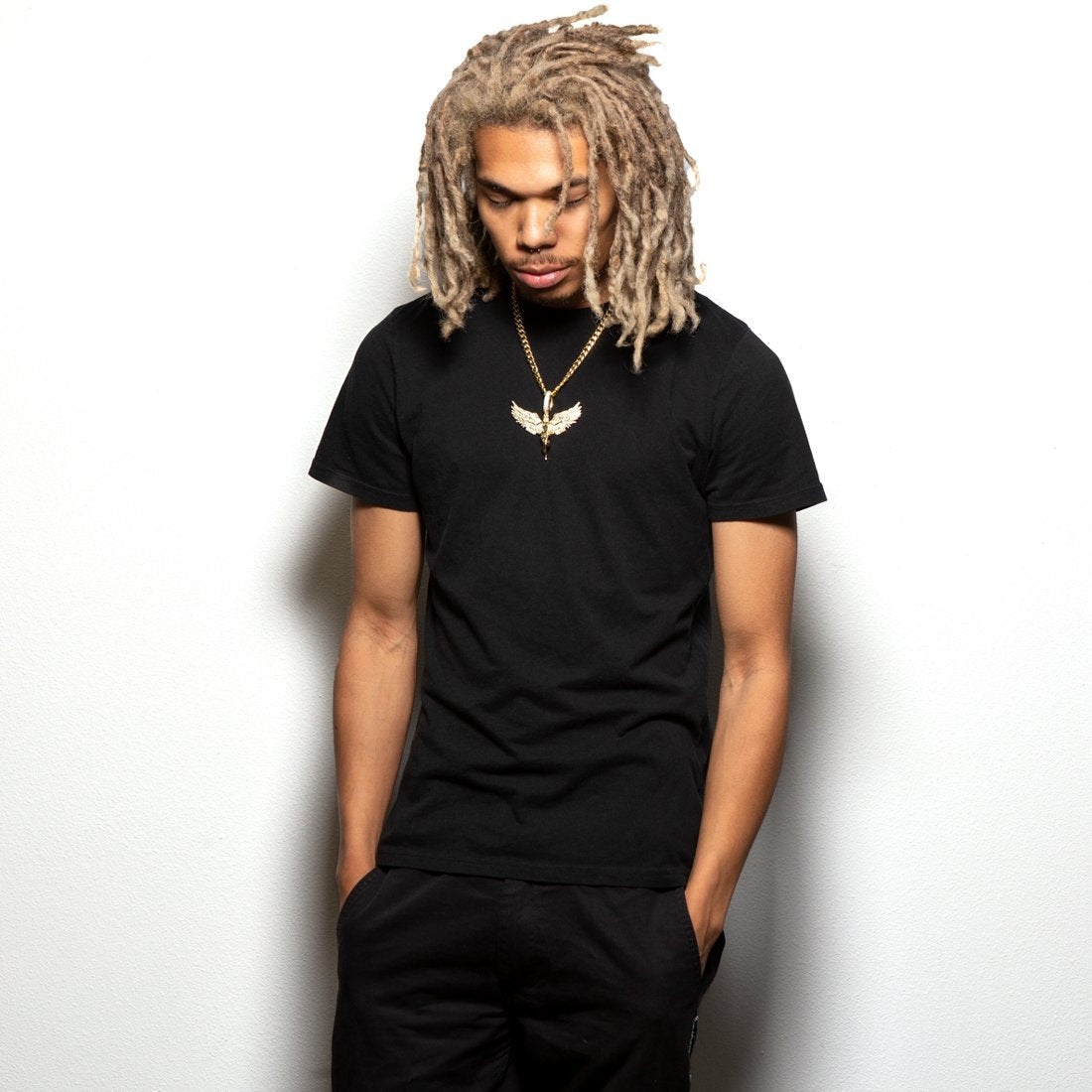 The Soaring Angel spreads its wings to take flight, elevating your game to new levels with its shine. Available in 14K Gold plating and white gold plating, the piece displays the fine details of its wings, body and robe, while the clear VVS Diamond Simulates cover the interior of the wings. Each necklace comes with a matching 8mm, 24" Miami Cuban Chain.